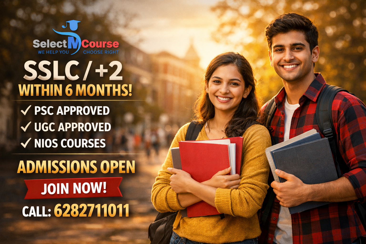 SelectMyCourse.com is a leading educational consultancy dedicated to helping students achieve their academic goals efficiently and effectively. We specialize in providing accelerated SSLC and Plus Two programs through NIOS (National Institute of Open Schooling).