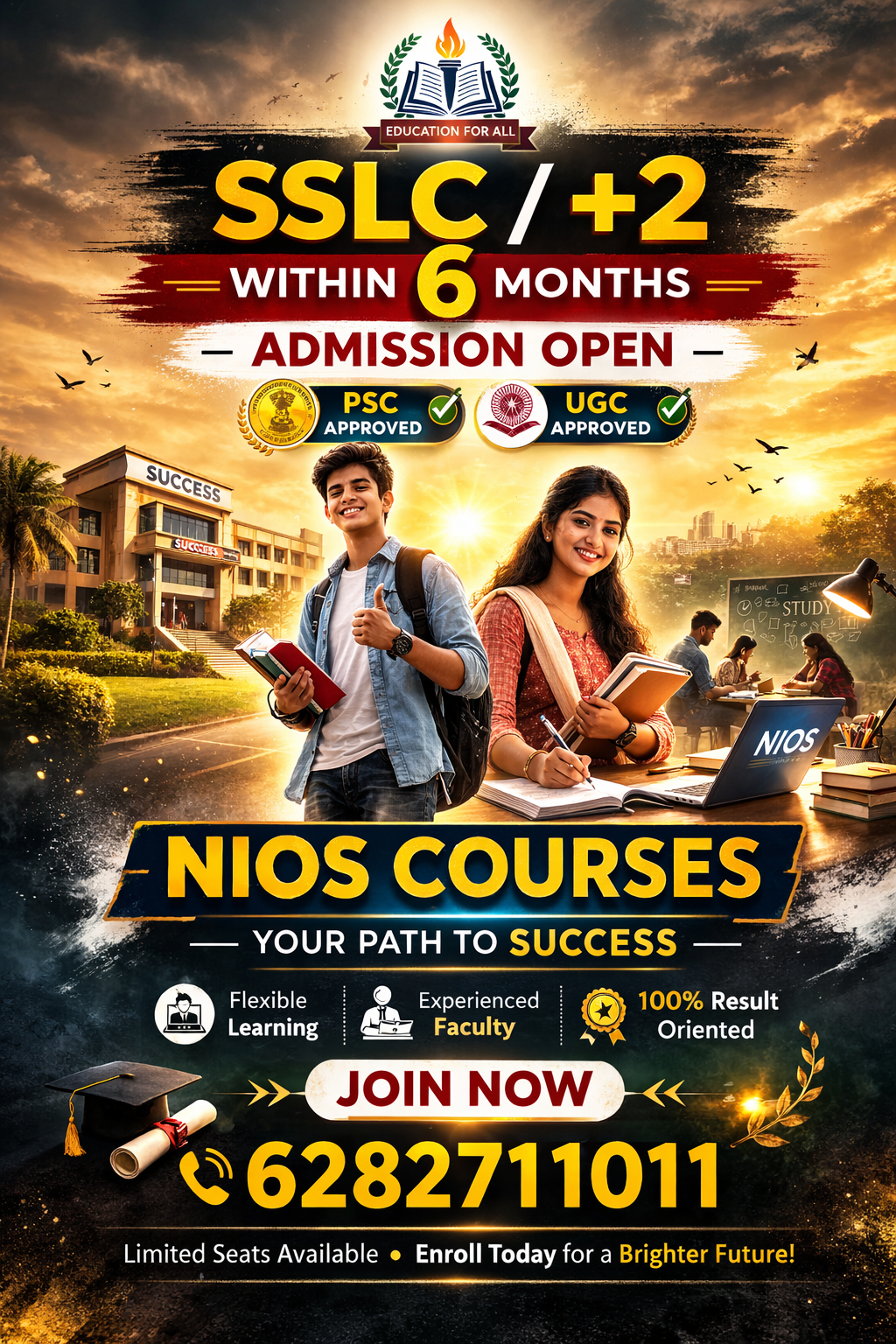 കേരളത്തിലെ SSLC /+2 പരീക്ഷയ്ക്ക് സമാനമായ സർട്ടിഫിക്കറ്റ് ആണ് NIOS വഴി വെറും 6 മാസം കൊണ്ട് ലഭിക്കുന്നത് .കേന്ദ്ര ഗവൺമെന്റ് അംഗീകാരമുള്ളതും , കേരള psc അംഗീകാരമുള്ളതാണ് SSLC /Plus Two ( NIOS ) National Institute of Open Schooling Senior Secondary School Leaving Certificate. 14 വയസു തികഞ്ഞ എല്ലാവര്ക്കും ഈ എക്സാം എഴുതാവുന്നതാണ് . സ്കൂള് വിദ്യാഭ്യാസം ഇടയ്ക്കുവെച്ചു നിര്ത്തിയവര്ക്കും പഠനം പാതി വഴിയിൽ മുടങ്ങിയവർക്കും വെറും 6 മാസം കൊണ്ട് 5 വിഷയം മാത്രം പരീക്ഷ എഴുതി Plus Two സ്വന്തമാക്കാം .